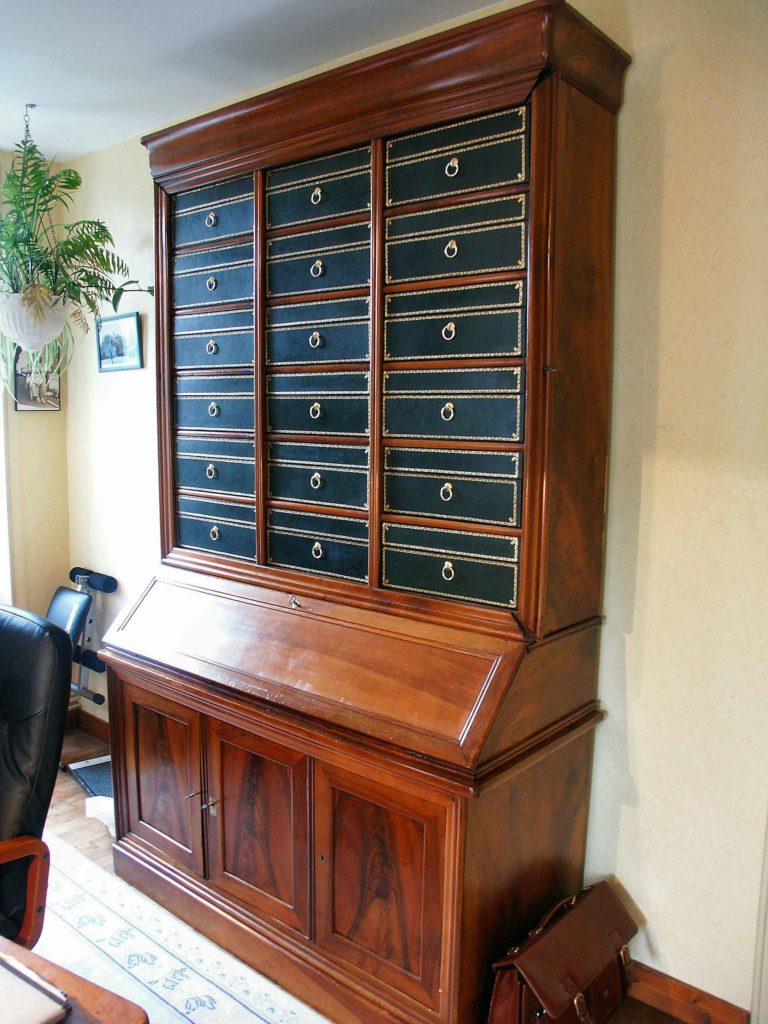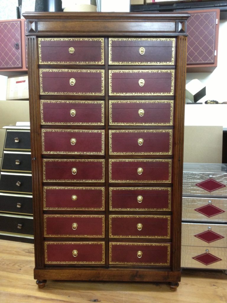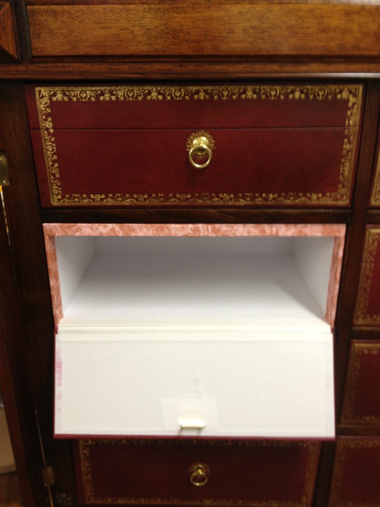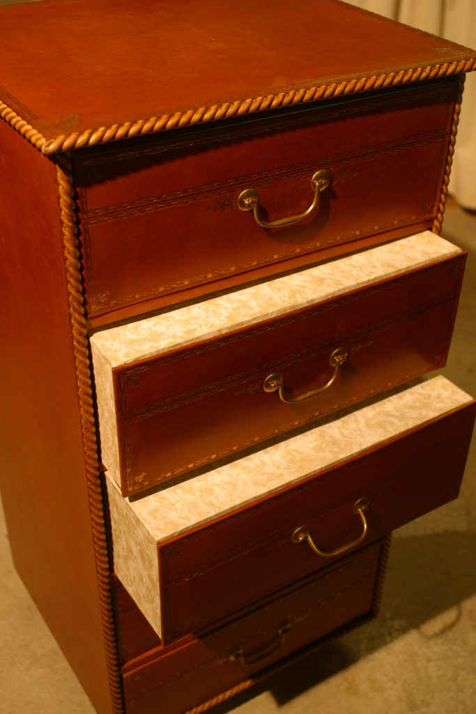 La fabrication de boîtes pour meuble cartonnier avec façades cuir, munies de poignées ou boutons, ornées d’un décor doré au style de votre choix.