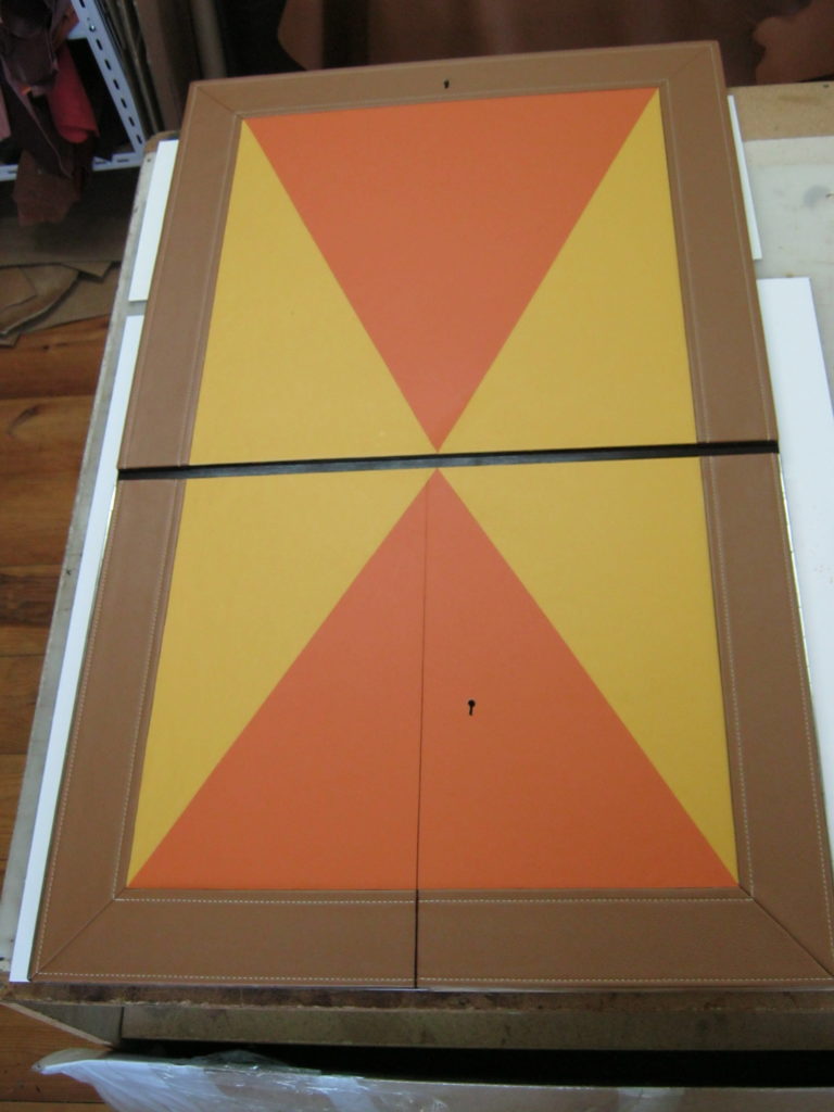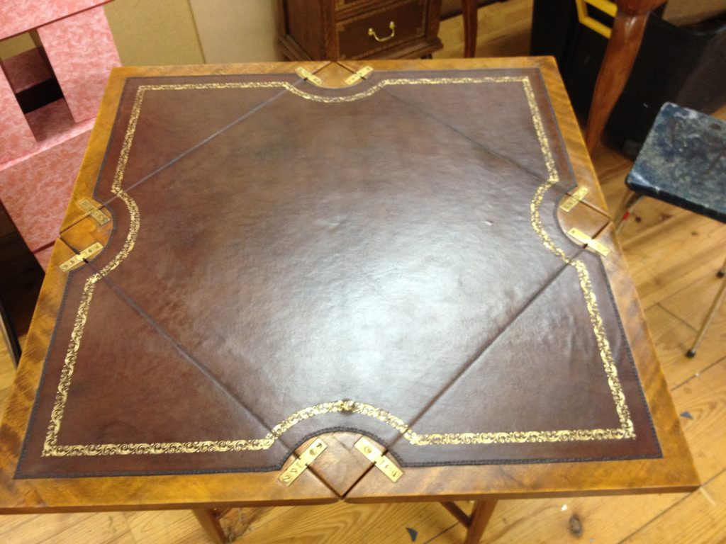 Réfection du tapis de feutre de votre table à jeux, avec la pose d’un galon en cuir doré.